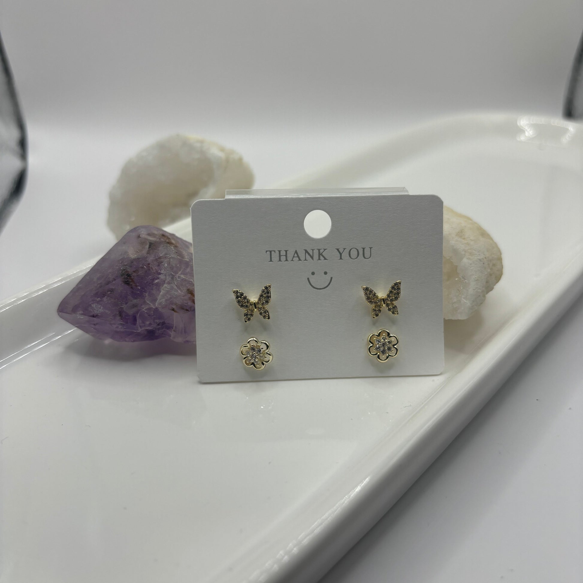 Butterfly & Flower Duel Earring Set - Gold with Gem