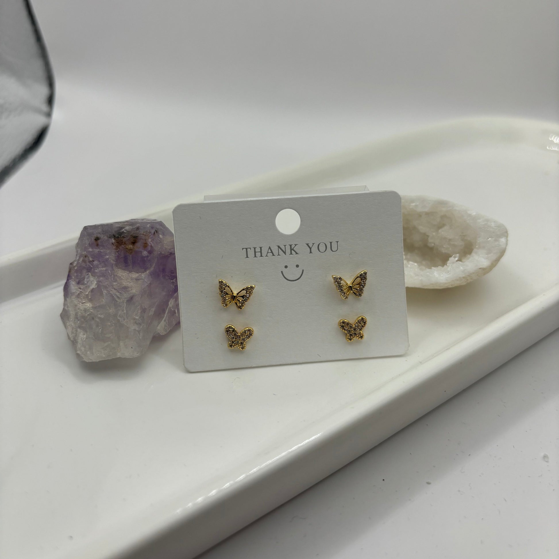 Add a touch of whimsy to your look with our Butterfly Gold Gem Duel Earring Set! These playful earrings feature fluttering butterflies adorned with dazzling gems, perfect for adding a touch of sparkle to any outfit. Embrace your playful side with this quirky set.