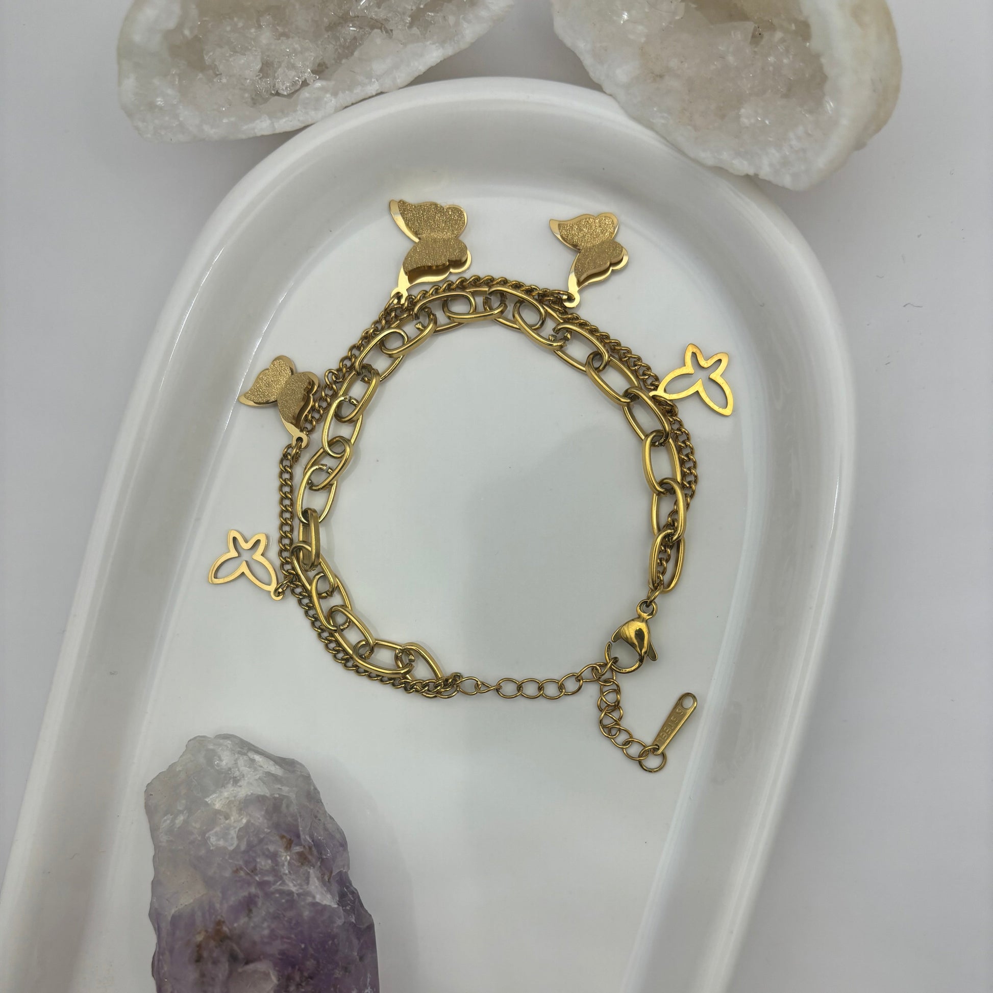 Unleash your wild side with our Duel Chain Butterfly Bracelet! Made of titanium steel, each chain features a playful butterfly charm. Perfect for adding a touch of whimsy to any outfit. (Double the fun with this butterfly bracelet! Made of titanium steel, each chain brings a sense of playfulness with its butterfly charm.)