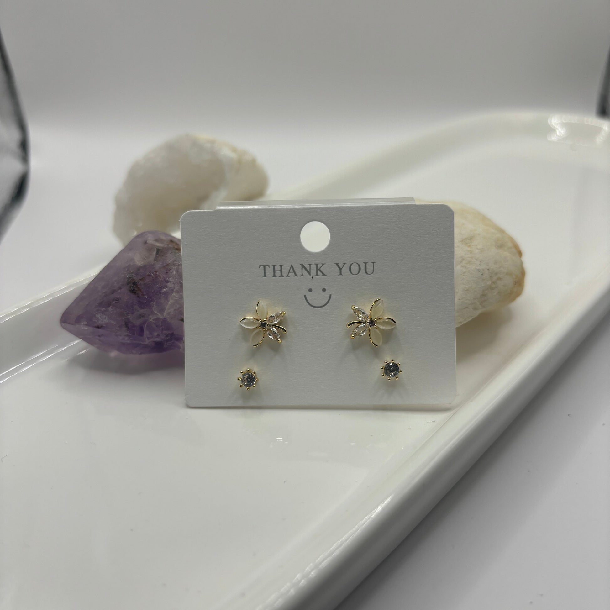 Double the fun with this Flower & Stud Earring Duel Set! Up your earring game with our gold and gem set, perfect for any occasion. Stun everyone with the intricate flower design or keep it simple and chic with the classic studs. (Note: only one duel per customer, please.)
