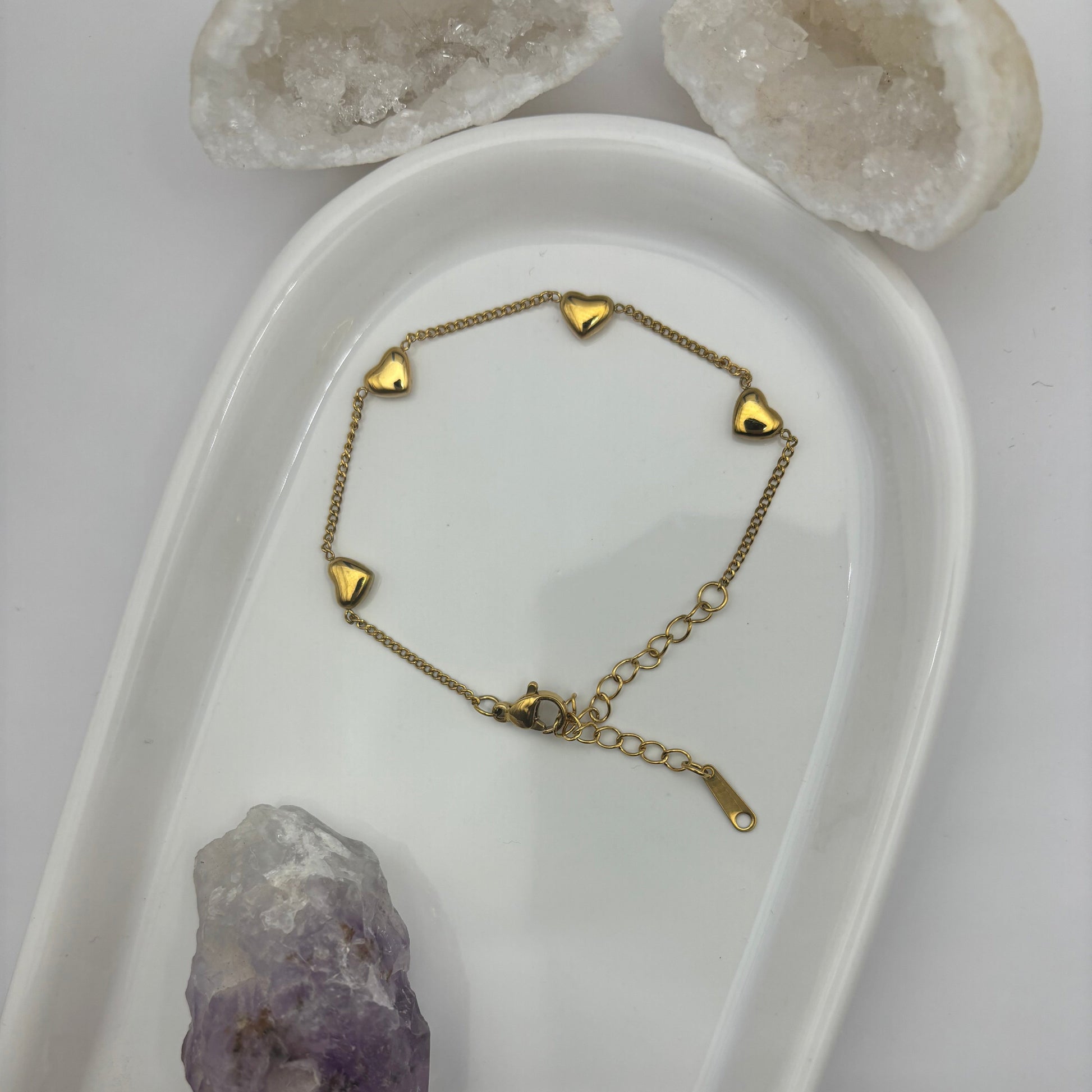 This heart-shaped bracelet will steal yours (and everyone's) heart! Crafted with titanium steel and plated in a luxurious gold, this bracelet is the perfect blend of durability and style. A fun and playful addition to any jewelry collection.