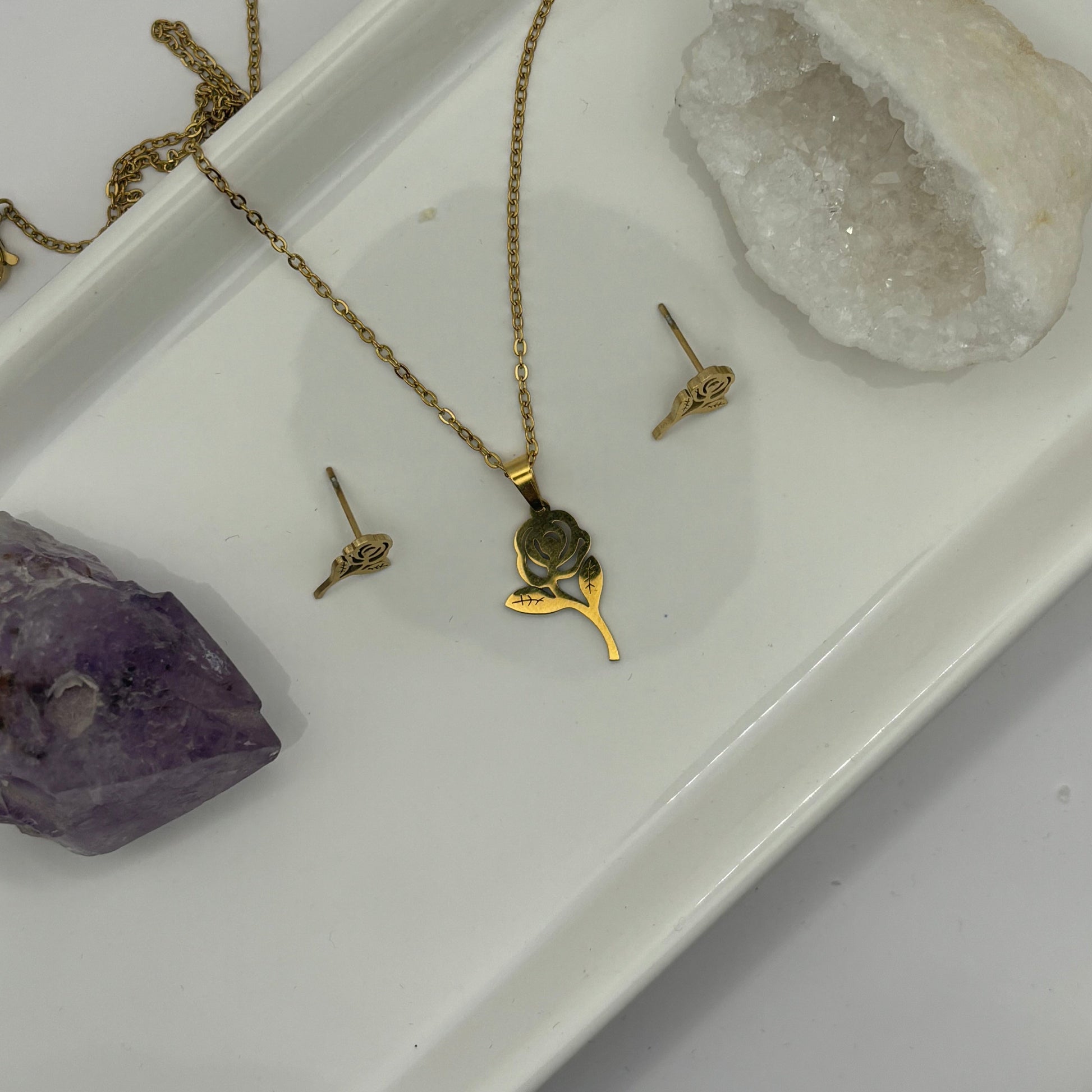 Add a touch of elegance and charm to any outfit with our Gold Necklace & Earring Rose Bundle. Featuring delicate gold chains and stunning rose-shaped earrings, this bundle is the perfect way to elevate your style. Perfect for any occasion, this bundle is a must-have for any fashion-forward individual.