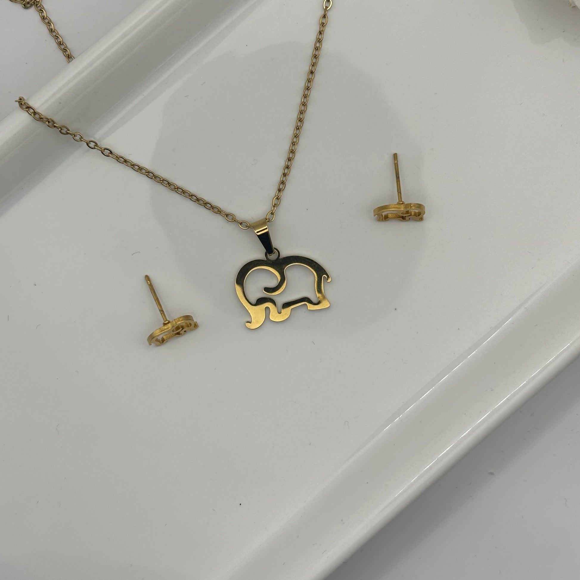 Complete your look with our Necklace & Earring Elephant Animal Gold Bundle. Made with high-quality materials, this bundle features a unique elephant design that adds a touch of playful elegance to any outfit. Perfect for animal lovers and those looking to make a stylish statement.