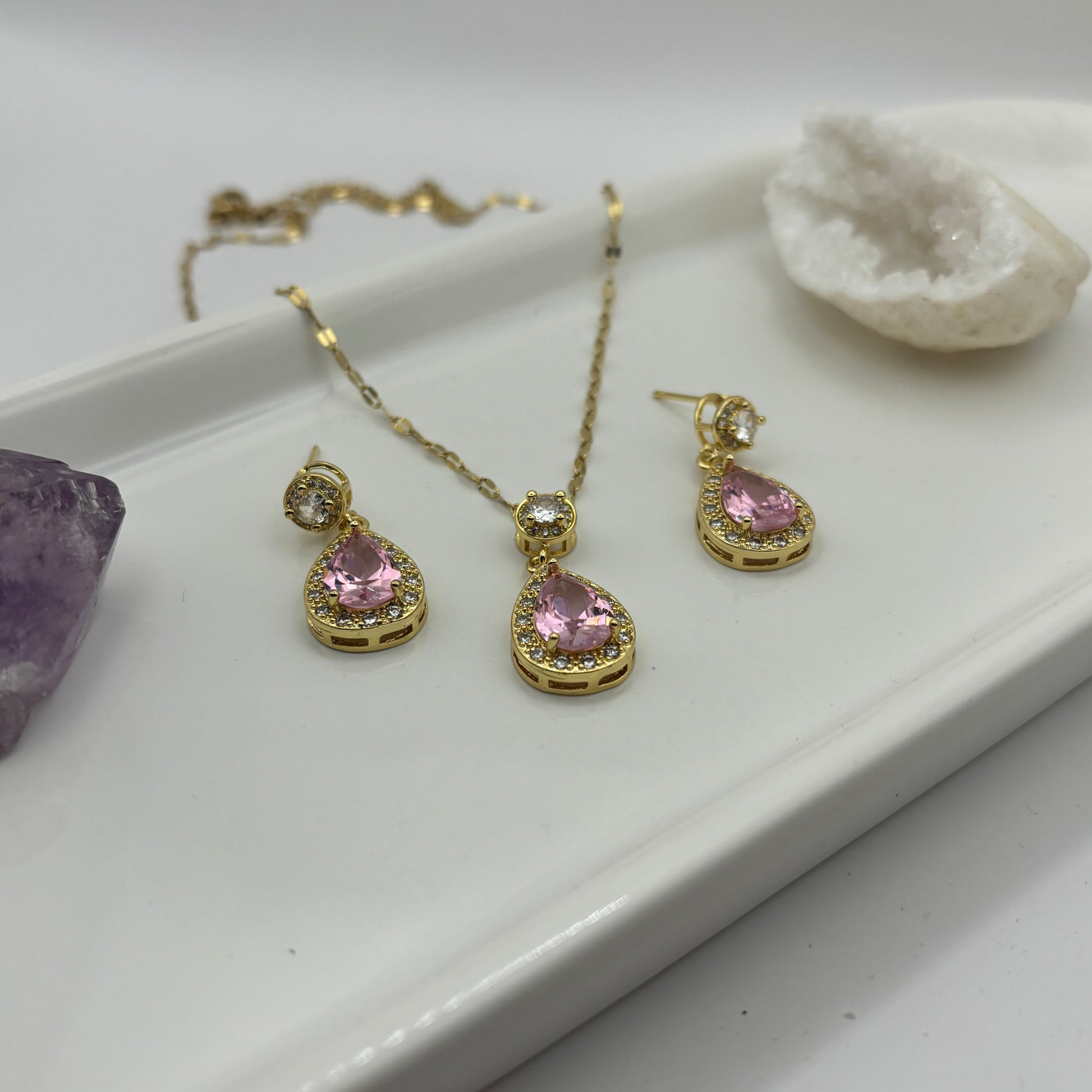 Necklace & Earring Pink Gem Gold Bundle